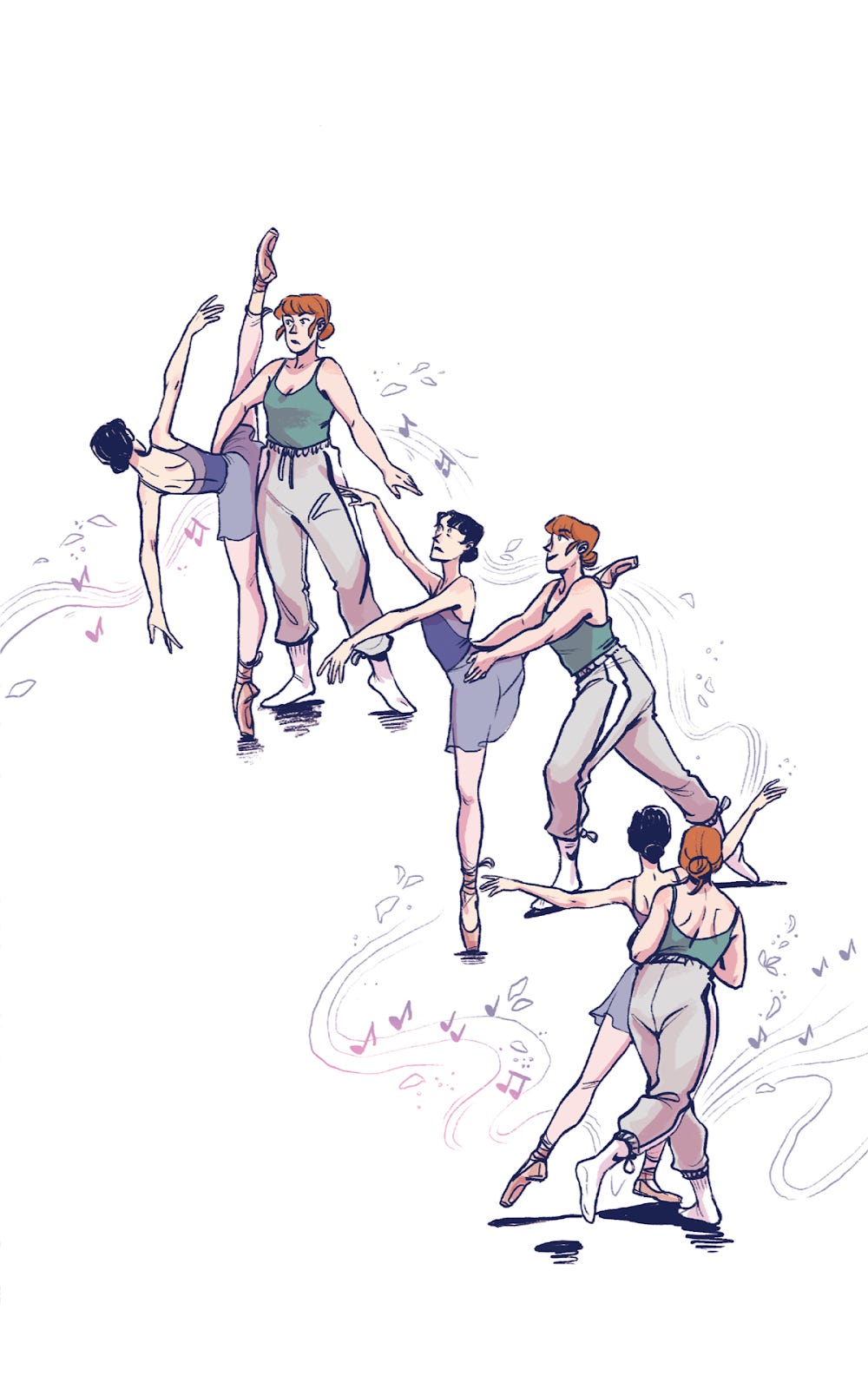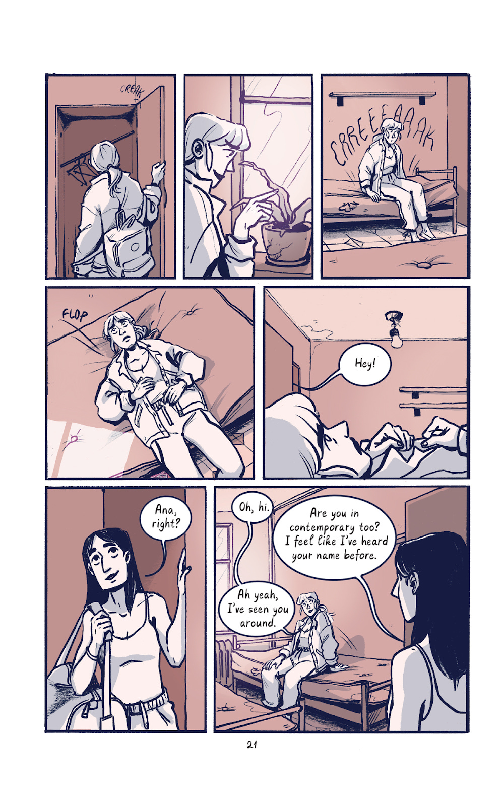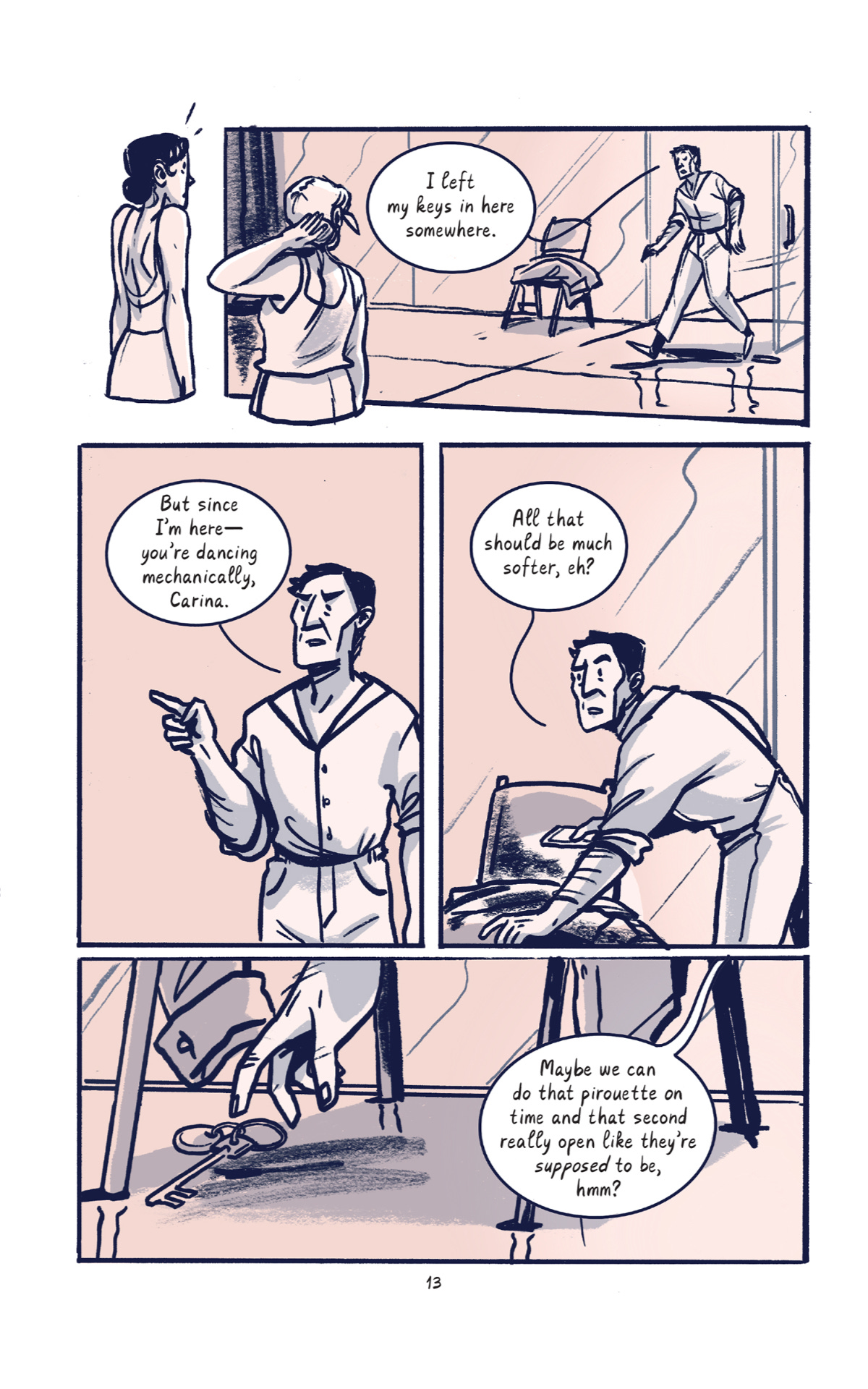 I think the overall color gamut (the relative quantity of each color used on the page) is a key difference as well. Spinning uses a lot of spot blacks (er. Spot dark purples I guess lol), while Leap is overall more reliant on the dusty rose hue it uses, and mostly saves the dark purples for some characters’ hair. This leads to Leap feeling brighter and Spinning feeling moodier overall, even though Spinning has light moments and Leap has darker moments too.