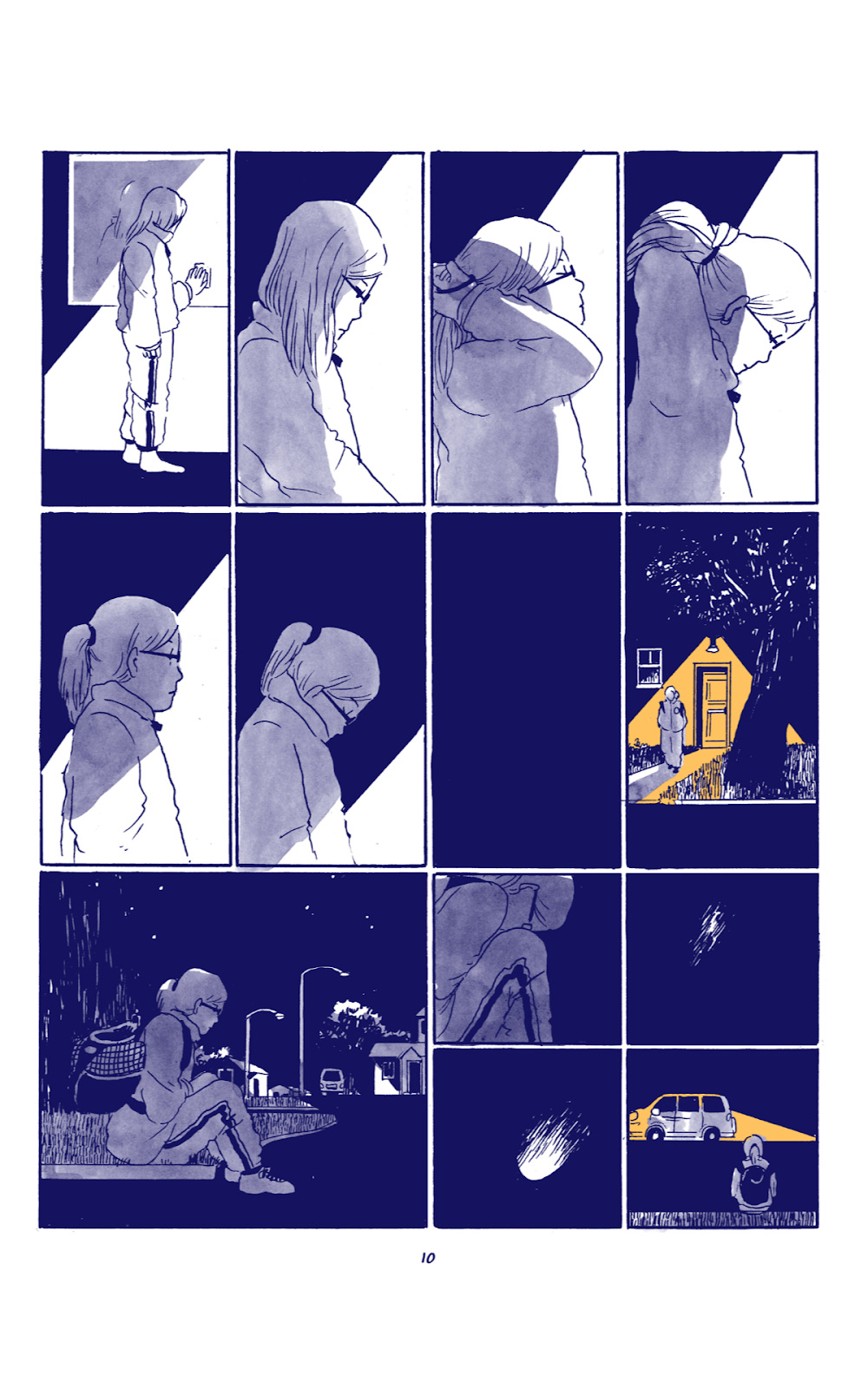 When I think about Spinning (and Tillie’s1 work generally), I think about freeform, abstract kind of montagey pages without a lot of panel borders, but looking at Spinning again that’s not really the case for most of the book. While she does have occasional splash pages with heavy spot blacks, most of the pages follow a rigid six-panel grid.
